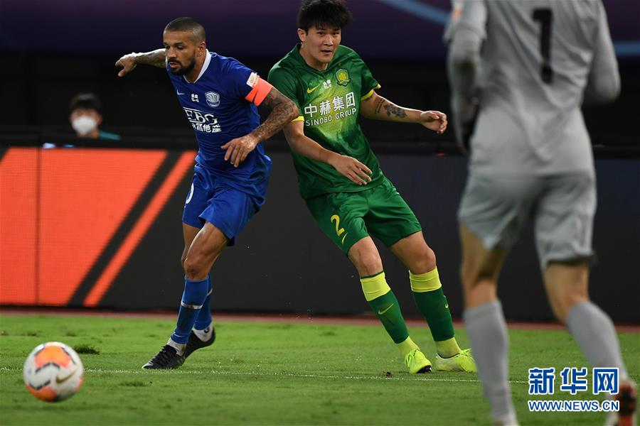 8月27日,石家庄永昌队球员马修斯(左)与北京中赫国安队球员金玟哉在比赛中拼抢。 当日,在2020赛季中国足球协会超级联赛第一阶段(苏州赛区)第七轮比赛中,石家庄永昌队以2比2战平北京中赫国安队。 新华社记者韩瑜庆摄