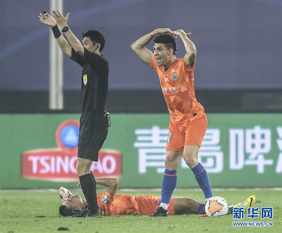 8月29日,山东鲁能泰山队球员莫伊塞斯(右)在比赛中呼喊队医进场为队友郑铮(下)治疗。 当日,在2020赛季中国足球协会超级联赛第一阶段(大连赛区)第八轮比赛中,山东鲁能泰山队对阵大连人队。 新华社记者 潘昱龙 摄