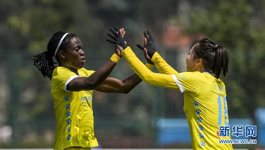 9月2日,江苏苏宁女足球员塔比莎(左)进球后与队友击掌庆祝。 当日,在2020年中国足球协会女子足球超级联赛第四轮比赛中,江苏苏宁女足以5比1战胜浙江杭州女足。 新华社记者江文耀摄
