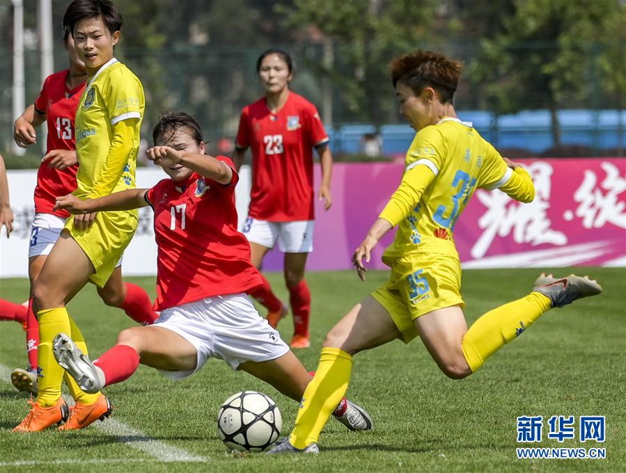 9月2日,江苏苏宁女足球员龚丽(右一)在比赛中射门。 当日,在2020年中国足球协会女子足球超级联赛第四轮比赛中,江苏苏宁女足以5比1战胜浙江杭州女足。 新华社记者江文耀摄