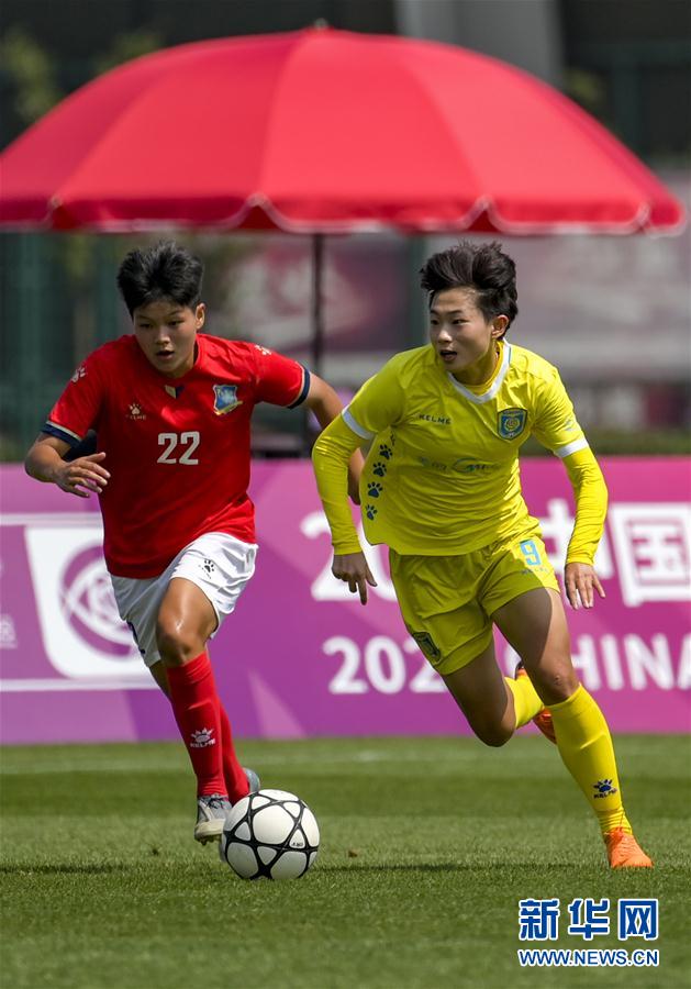 9月2日,江苏苏宁女足球员吴澄舒(右)在比赛中突破。 当日,在2020年中国足球协会女子足球超级联赛第四轮比赛中,江苏苏宁女足以5比1战胜浙江杭州女足。 新华社记者江文耀摄