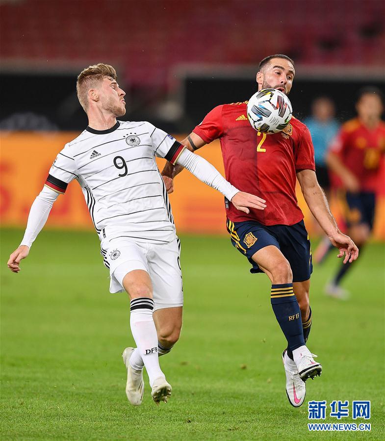 9月3日,德国队球员维尔纳(左)在比赛中与西班牙队球员卡瓦哈尔拼抢。 当日,在德国斯图加特举行的一场欧洲国家足球联赛的比赛中,德国队主场以1比1战平西班牙队。 新华社发
