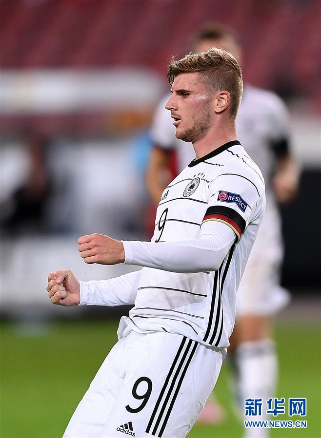 9月3日,德国队球员维尔纳在比赛中进球后庆祝。 当日,在德国斯图加特举行的一场欧洲国家足球联赛的比赛中,德国队主场以1比1战平西班牙队。 新华社发