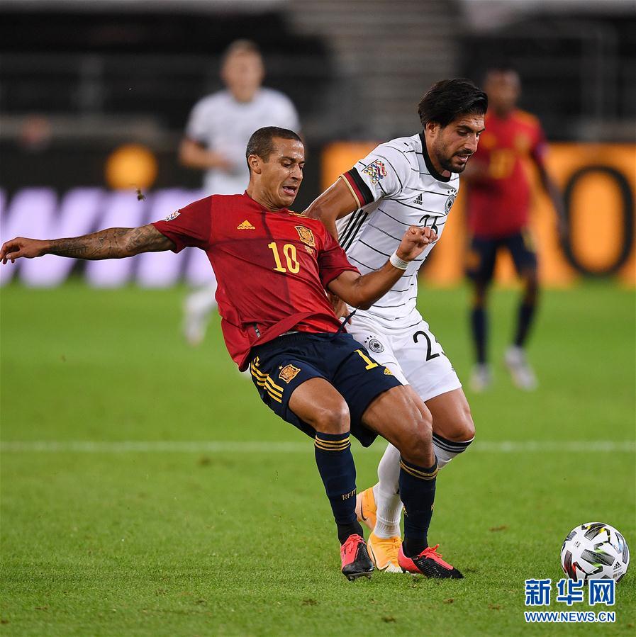 9月3日,德国队球员埃姆雷·詹(右)在比赛中与西班牙队球员蒂亚戈拼抢。 当日,在德国斯图加特举行的一场欧洲国家足球联赛的比赛中,德国队主场以1比1战平西班牙队。 新华社发