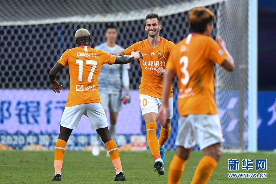 9月6日,武汉卓尔队球员巴普蒂斯唐(中)进球后与队友埃弗拉(左)庆祝。 当日,在2020赛季中国足球协会超级联赛第一阶段(苏州赛区)第九轮比赛中,武汉卓尔队以2比2战平北京中赫国安队。 新华社记者李博摄