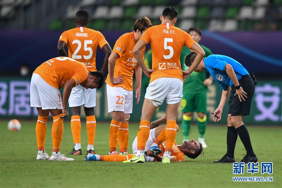 9月6日,武汉卓尔队球员巴普蒂斯唐(下)在比赛中受伤。 当日,在2020赛季中国足球协会超级联赛第一阶段(苏州赛区)第九轮比赛中,武汉卓尔队以2比2战平北京中赫国安队。 新华社记者李博摄
