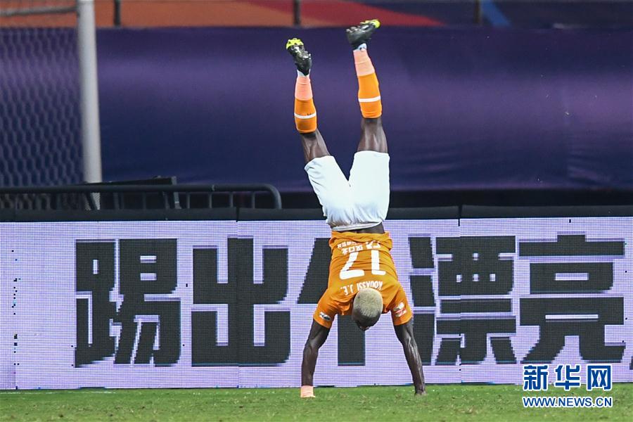 9月6日,武汉卓尔队球员埃弗拉进球后庆祝。 当日,在2020赛季中国足球协会超级联赛第一阶段(苏州赛区)第九轮比赛中,武汉卓尔队以2比2战平北京中赫国安队。 新华社记者李博摄