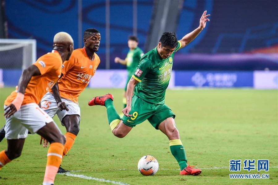 9月6日,北京中赫国安队球员张玉宁(右)在比赛中传球。 当日,在2020赛季中国足球协会超级联赛第一阶段(苏州赛区)第九轮比赛中,武汉卓尔队以2比2战平北京中赫国安队。 新华社记者李博摄