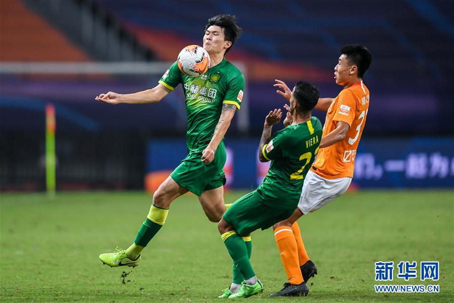9月6日,北京中赫国安队球员金玟哉(左)与武汉卓尔队球员董学升(右)在比赛中拼抢。 当日,在2020赛季中国足球协会超级联赛第一阶段(苏州赛区)第九轮比赛中,武汉卓尔队以2比2战平北京中赫国安队。 新华社记者李博摄