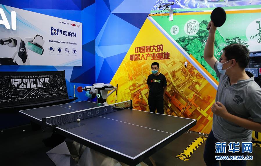 9月7日,在服贸会综合展区,发球机器人与观众“对战”。 2020年中国国际服务贸易交易会于9月4日至9日在北京举行。在服贸会综合展区一处展台,一个名叫“庞伯特”的乒乓球发球机器人吸引了许多观众的目光。据了解,这个机器人不仅能够自动发球,还可以根据用户喜好,对球速、角度、高度、落点区域进行个性化设置。 新华社记者 潘思危 摄