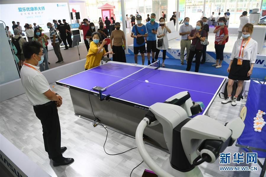 9月7日,参观者在体验展出的一款“发球机器人”。 2020年中国国际服务贸易交易会于9月4日至9日在北京举行。在服贸会综合展区一处展台,一个名叫“庞伯特”的乒乓球发球机器人吸引了许多观众的目光。据了解,这个机器人不仅能够自动发球,还可以根据用户喜好,对球速、角度、高度、落点区域进行个性化设置。 新华社记者 鲁鹏 摄