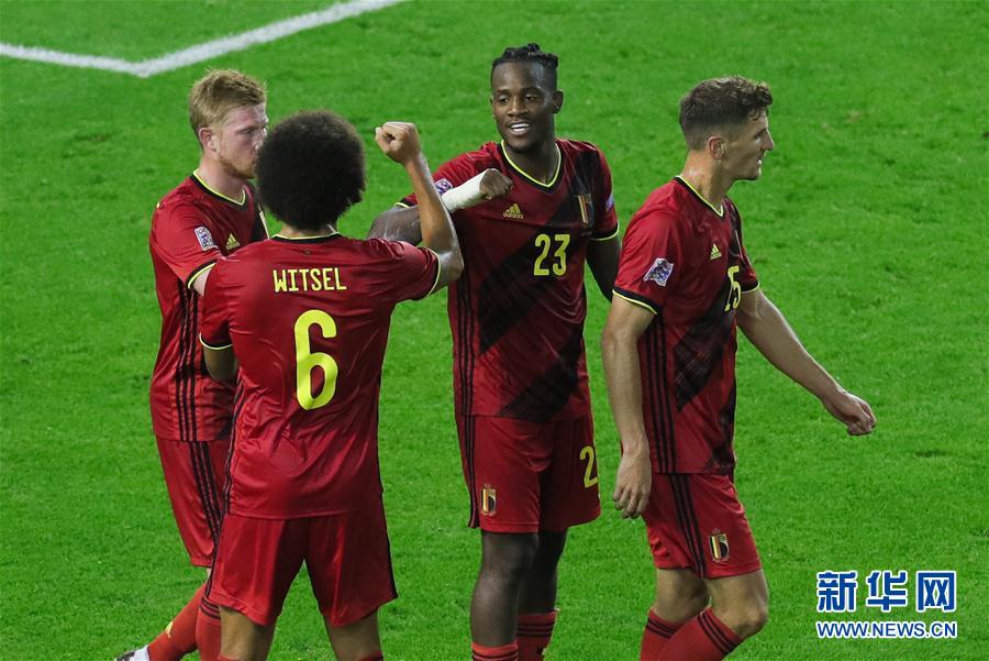 9月8日,比利时队球员巴舒亚伊(右二)进球后与队友庆祝。 当日,在布鲁塞尔进行的2020欧洲国家足球联赛A级第二组第二轮比赛中,比利时队主场以5比1战胜冰岛队。 新华社记者郑焕松摄
