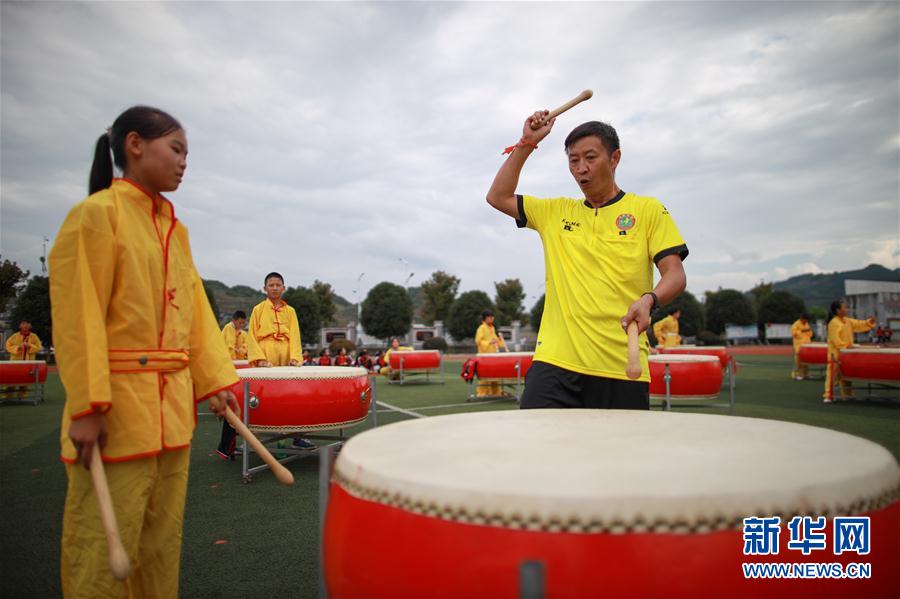 任达武是贵州省遵义市余庆县敖溪小学的一名体育老师,今年45岁的他已经带领老师、学生开展民族、民间体育课程近10年。打威风锣鼓、走板鞋、抽陀螺、踩高跷、押加等充满趣味的运动项目被他搬进了体育课堂。学生们还在任达武的指导下,参与制作板鞋、高跷等运动器具。任达武表示:“民族、民间体育项目进课堂不仅锻炼了孩子们的身体,还传承了优秀的传统文化,这样的体育课寓教于乐,特别受孩子们的喜爱。” 图为9月9日,任达武(右)指导学生打威风锣鼓。 新华社记者刘续摄