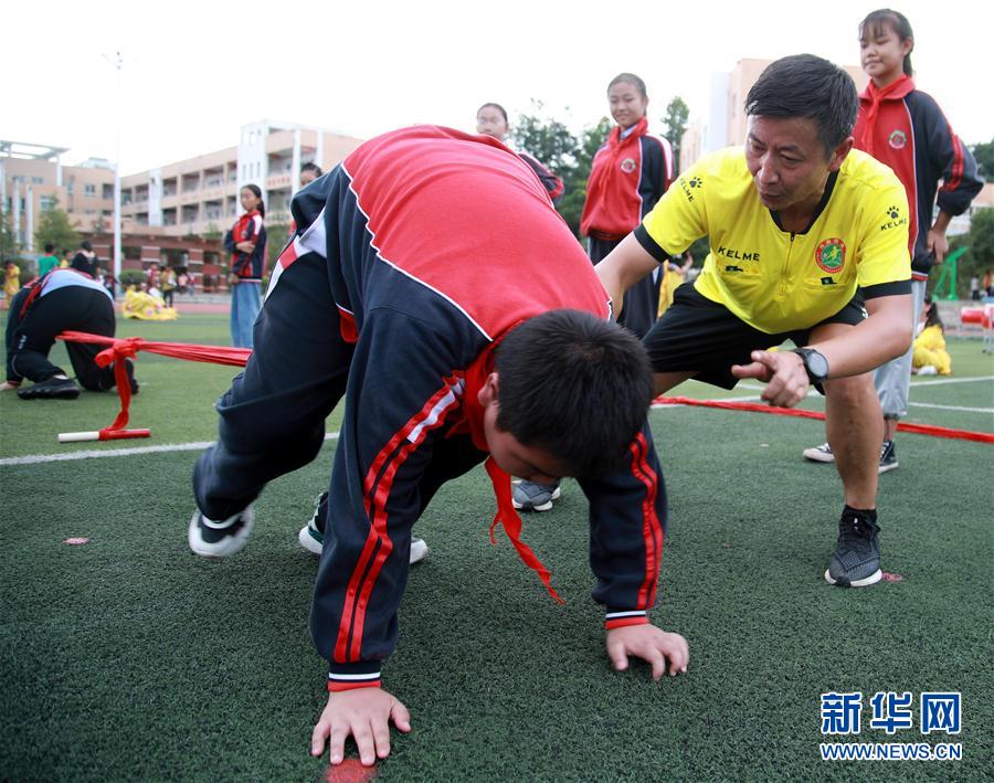任达武是贵州省遵义市余庆县敖溪小学的一名体育老师,今年45岁的他已经带领老师、学生开展民族、民间体育课程近10年。打威风锣鼓、走板鞋、抽陀螺、踩高跷、押加等充满趣味的运动项目被他搬进了体育课堂。学生们还在任达武的指导下,参与制作板鞋、高跷等运动器具。任达武表示:“民族、民间体育项目进课堂不仅锻炼了孩子们的身体,还传承了优秀的传统文化,这样的体育课寓教于乐,特别受孩子们的喜爱。” 图为9月9日,任达武(右)指导学生押加的技术要领。 新华社记者刘续摄