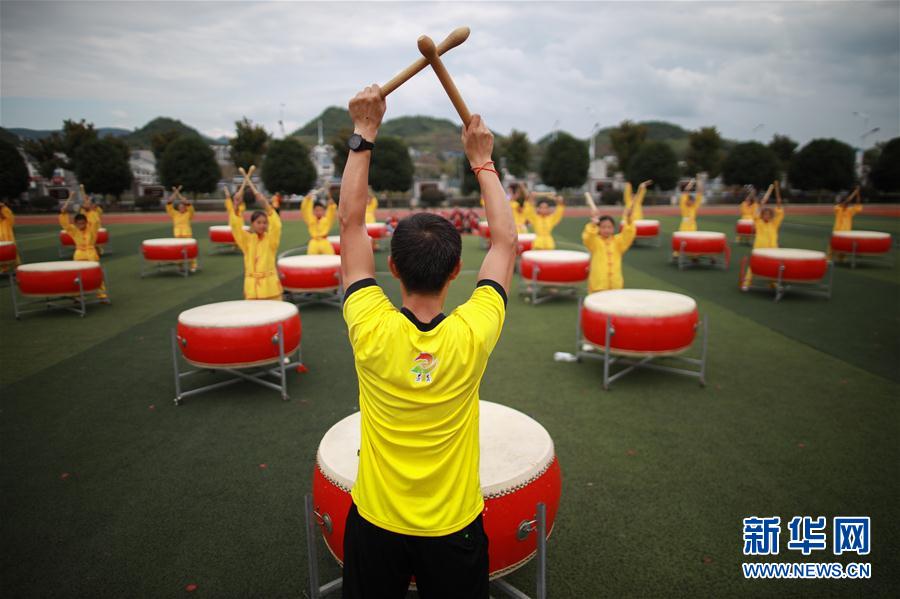 任达武是贵州省遵义市余庆县敖溪小学的一名体育老师,今年45岁的他已经带领老师、学生开展民族、民间体育课程近10年。打威风锣鼓、走板鞋、抽陀螺、踩高跷、押加等充满趣味的运动项目被他搬进了体育课堂。学生们还在任达武的指导下,参与制作板鞋、高跷等运动器具。任达武表示:“民族、民间体育项目进课堂不仅锻炼了孩子们的身体,还传承了优秀的传统文化,这样的体育课寓教于乐,特别受孩子们的喜爱。” 图为9月9日,任达武(前)带领学生打威风锣鼓。 新华社记者刘续摄