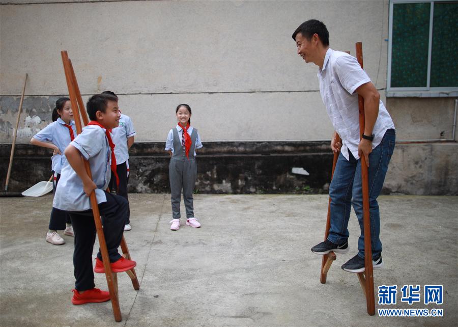 任达武是贵州省遵义市余庆县敖溪小学的一名体育老师,今年45岁的他已经带领老师、学生开展民族、民间体育课程近10年。打威风锣鼓、走板鞋、抽陀螺、踩高跷、押加等充满趣味的运动项目被他搬进了体育课堂。学生们还在任达武的指导下,参与制作板鞋、高跷等运动器具。任达武表示:“民族、民间体育项目进课堂不仅锻炼了孩子们的身体,还传承了优秀的传统文化,这样的体育课寓教于乐,特别受孩子们的喜爱。” 图为9月9日,任达武(右一)和学生试踩一起制作的高跷。 新华社记者刘续摄