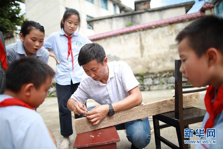 任达武是贵州省遵义市余庆县敖溪小学的一名体育老师,今年45岁的他已经带领老师、学生开展民族、民间体育课程近10年。打威风锣鼓、走板鞋、抽陀螺、踩高跷、押加等充满趣味的运动项目被他搬进了体育课堂。学生们还在任达武的指导下,参与制作板鞋、高跷等运动器具。任达武表示:“民族、民间体育项目进课堂不仅锻炼了孩子们的身体,还传承了优秀的传统文化,这样的体育课寓教于乐,特别受孩子们的喜爱。” 图为9月9日,任达武(右二)向学生示范如何制作板鞋。 新华社记者刘续摄