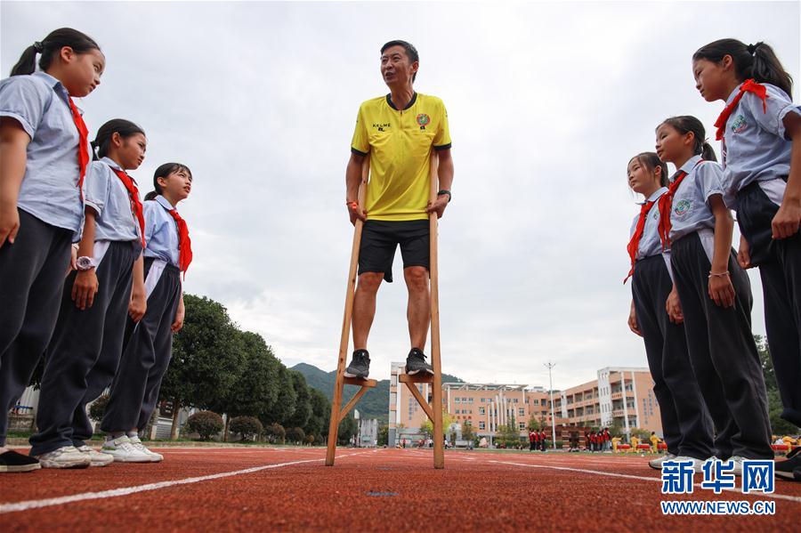任达武是贵州省遵义市余庆县敖溪小学的一名体育老师,今年45岁的他已经带领老师、学生开展民族、民间体育课程近10年。打威风锣鼓、走板鞋、抽陀螺、踩高跷、押加等充满趣味的运动项目被他搬进了体育课堂。学生们还在任达武的指导下,参与制作板鞋、高跷等运动器具。任达武表示:“民族、民间体育项目进课堂不仅锻炼了孩子们的身体,还传承了优秀的传统文化,这样的体育课寓教于乐,特别受孩子们的喜爱。” 图为9月9日,任达武(中)向学生示范踩高跷。 新华社记者刘续摄