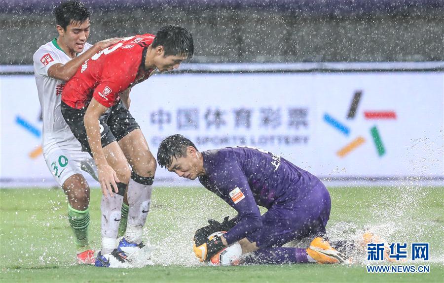 9月10日,上海上港队守门员颜骏凌(右)在比赛中扑救。 当日,在2020赛季中国足球协会超级联赛第一阶段(苏州赛区)第十轮比赛中,上海上港队以2比1战胜青岛黄海青港队。 新华社记者杨磊摄