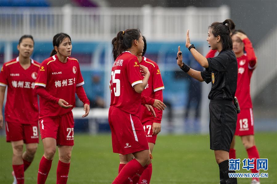 9月12日,广东梅州五华队球员对裁判判罚表示异议。 当日,在2020年中国足球协会女子足球超级联赛第七轮比赛中,广东梅州五华队以2比2战平浙江杭州女足队。 新华社发(陈欣波摄)