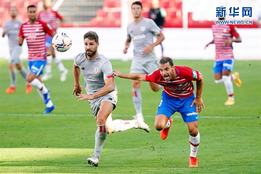 9月12日,格拉纳达队球员索尔达多(右)与毕尔巴鄂竞技队球员阿尔瓦雷斯在比赛中拼抢。 当日,在2020-2021赛季西班牙足球甲级联赛首轮比赛中,格拉纳达队主场以2比0战胜毕尔巴鄂竞技队。 新华社发(格拉纳达队供图)