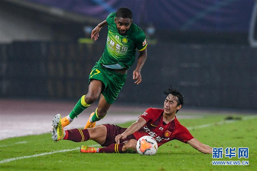 9月15日,北京中赫国安队球员巴坎布(左)在比赛中突破。 当日,在2020赛季中国足球协会超级联赛第一阶段(苏州赛区)第11轮比赛中,河北华夏幸福队以3战比3战平北京中赫国安队。 新华社记者 李博 摄