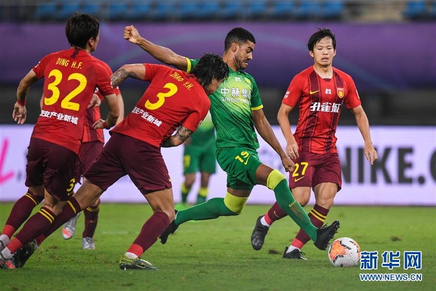 9月15日,北京中赫国安队球员阿兰(右二)在比赛中射门。 当日,在2020赛季中国足球协会超级联赛第一阶段(苏州赛区)第11轮比赛中,河北华夏幸福队以3比3战平北京中赫国安队。 新华社记者 李博 摄