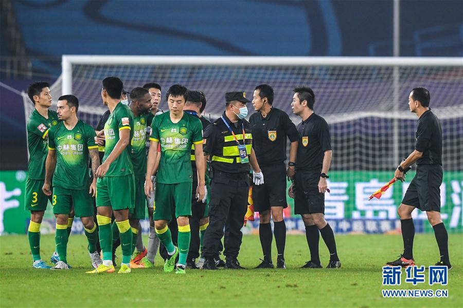 9月15日,北京中赫国安队球员在赛后与主裁判金京元(右二)等交流。 当日,在2020赛季中国足球协会超级联赛第一阶段(苏州赛区)第11轮比赛中,河北华夏幸福队以3比3战平北京中赫国安队。 新华社记者 李博 摄