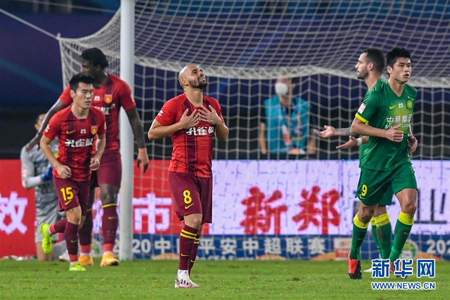 9月15日,河北华夏幸福队球员保利尼奥(中)在比赛中错失进球机会。 当日,在2020赛季中国足球协会超级联赛第一阶段(苏州赛区)第11轮比赛中,河北华夏幸福队以3战比3战平北京中赫国安队。 新华社记者 李博 摄
