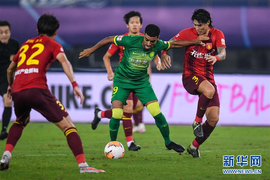 9月15日,北京中赫国安队球员阿兰(右二)在比赛中与河北华夏幸福队球员赵宇豪(右一)拼抢。 当日,在2020赛季中国足球协会超级联赛第一阶段(苏州赛区)第11轮比赛中,河北华夏幸福队以3战比3战平北京中赫国安队。 新华社记者 李博 摄