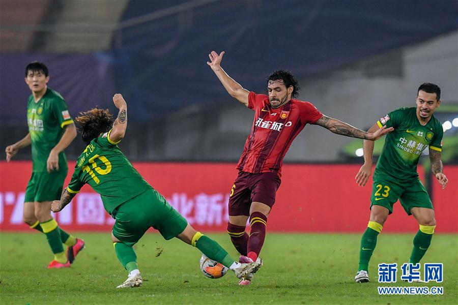 9月15日,河北华夏幸福球员高拉特(右二)与北京中赫国安队球员张稀哲(左二)在比赛中拼抢。 当日,在2020赛季中国足球协会超级联赛第一阶段(苏州赛区)第11轮比赛中,河北华夏幸福队以3比3战平北京中赫国安队。 新华社记者 李博 摄