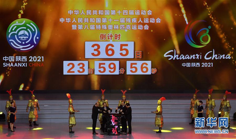 这是9月15日在西安奥体中心体育馆拍摄的中华人民共和国第十四届运动会倒计时一周年活动现场。 当日,中华人民共和国第十四届运动会倒计时一周年活动在西安奥体中心体育馆举行。第十四届全运会将于2021年9月15日至9月27日在陕西省举行。 新华社记者 李一博 摄