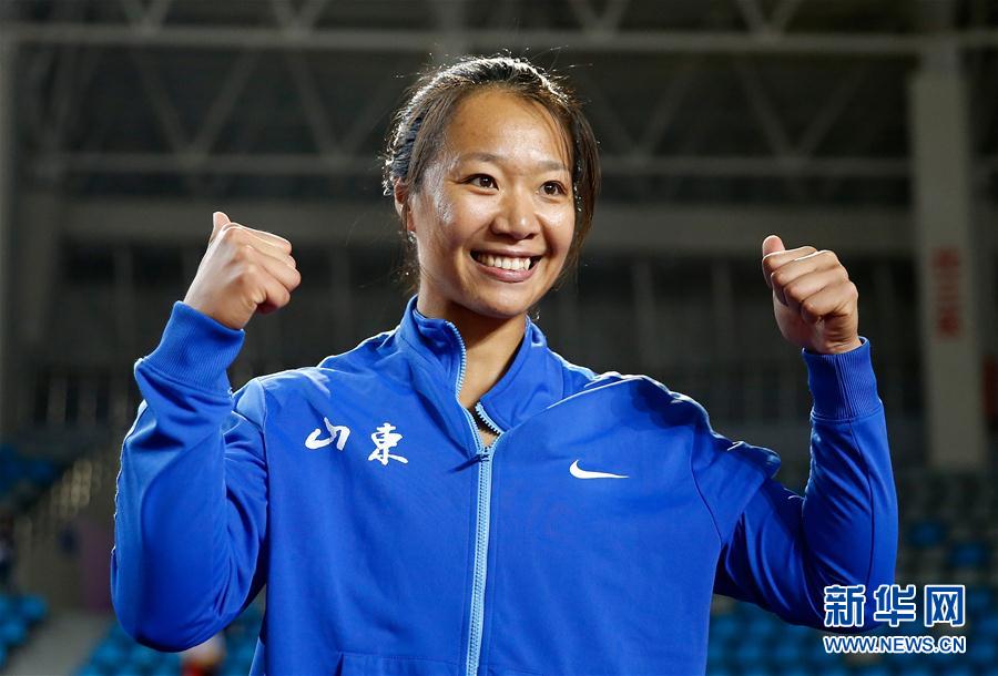 9月15日,山东队选手刘诗颖在夺冠后庆祝。她以67米29的成绩获得女子标枪比赛冠军。 当日,2020年全国田径锦标赛在浙江省绍兴市上虞体育场拉开战幕。 新华社记者 王丽莉 摄