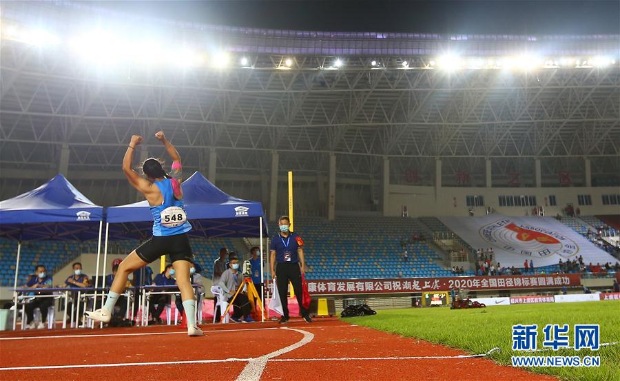 9月15日,山东队选手刘诗颖在决赛最后一投投出67米29后庆祝,最终,她凭借这一成绩获得女子标枪比赛冠军。 当日,2020年全国田径锦标赛在浙江省绍兴市上虞体育场拉开战幕。 新华社记者 王丽莉 摄