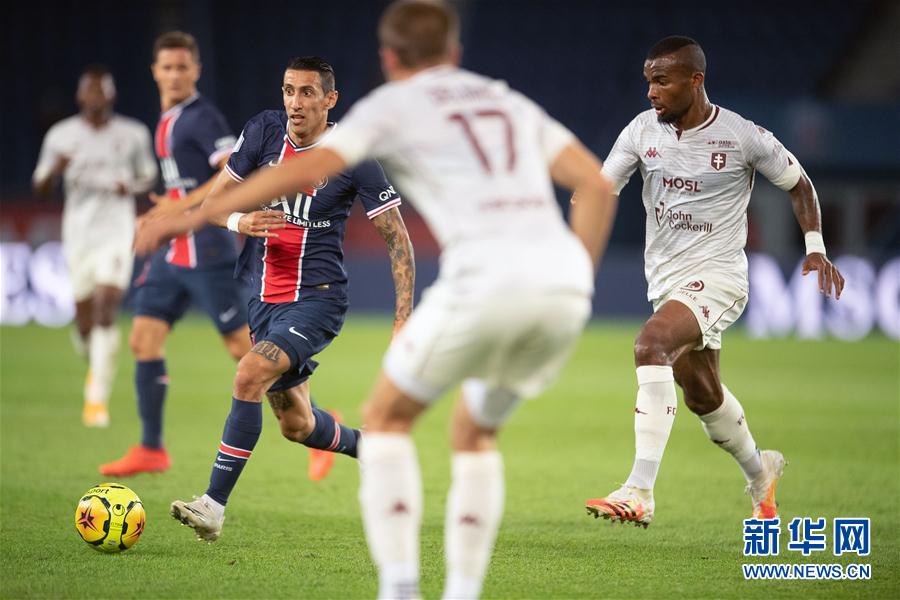 9月16日,巴黎圣日耳曼队球员迪马利亚(左三)在比赛中。 当日,在2020-2021赛季法国足球甲级联赛第一轮比赛中,巴黎圣日耳曼队主场以1比0战胜梅斯队。 新华社发(杰克·陈摄)