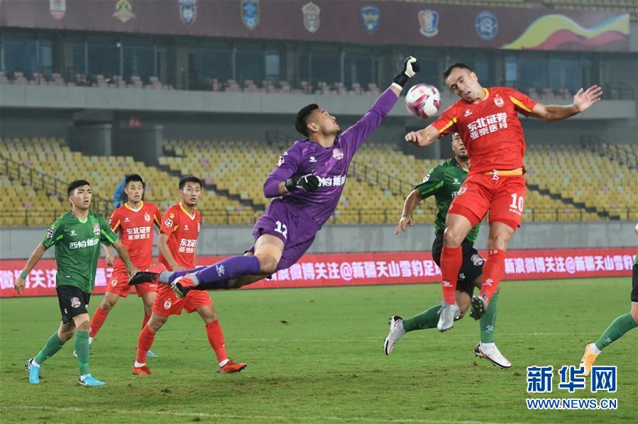 9月17日,新疆雪豹纳欢队守门员顾俊杰(左四)飞身扑球。 当日,在2020中国足球甲级联赛第一阶段(常州赛区)第2轮比赛中,新疆雪豹纳欢队以0比2不敌长春亚泰队。 新华社发(史康 摄)