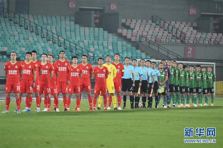 9月17日,双方球员和裁判员在开赛前的升旗仪式上。 当日,在2020中国足球甲级联赛第一阶段(常州赛区)第2轮比赛中,新疆雪豹纳欢队以0比2不敌长春亚泰队。 新华社发(史康 摄)