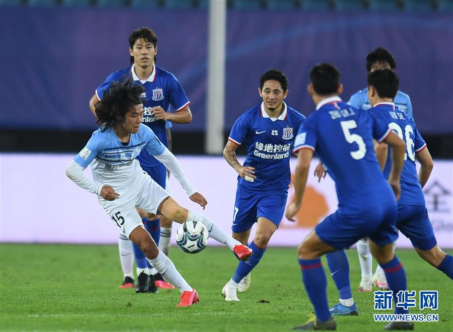 9月18日,广州富力队球员李提香(左)在比赛中带球进攻。 当日,在2020中国足协杯(大连赛区)第一轮比赛中,广州富力队和上海绿地申花队在常规时间内战成1比1平,通过点球大战,广州富力队以总比分6比4战胜上海绿地申花队。 新华社记者 龙雷 摄