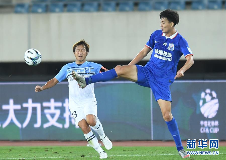 9月18日,上海绿地申花队球员蒋圣龙(右)在比赛中与广州富力队球员卢琳拼抢。 当日,在2020中国足协杯(大连赛区)第一轮比赛中,广州富力队和上海绿地申花队在常规时间内战成1比1平,通过点球大战,广州富力队以总比分6比4战胜上海绿地申花队。 新华社记者 龙雷 摄
