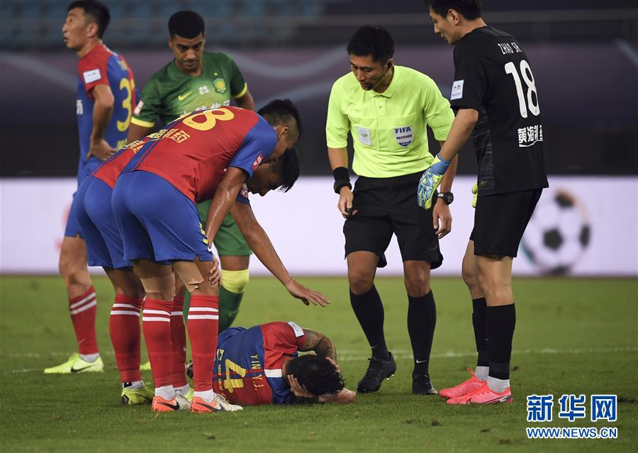 9月19日,青岛黄海青港队球员殷亚吉(下)在比赛中受伤倒地。 当日,在2020中国足协杯(苏州赛区)第一轮比赛中,北京中赫国安队以2比1战胜青岛黄海青港队。 新华社记者韩瑜庆摄