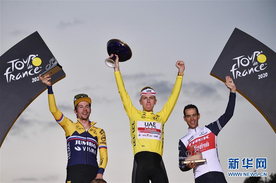 9月20日,冠军阿联酋航空车队斯洛文尼亚车手波加查尔(中)、亚军珍宝车队斯洛文尼亚车手罗格利奇(左)和季军崔克车队澳大利亚车手波特在领奖台上合影留念。 当日,2020环法自行车赛在巴黎香榭丽舍大街落下帷幕。阿联酋航空车队的波加查尔以87小时20分05秒的总成绩,成为环法历史上首位加冕总冠军的斯洛文尼亚车手。 新华社/法新