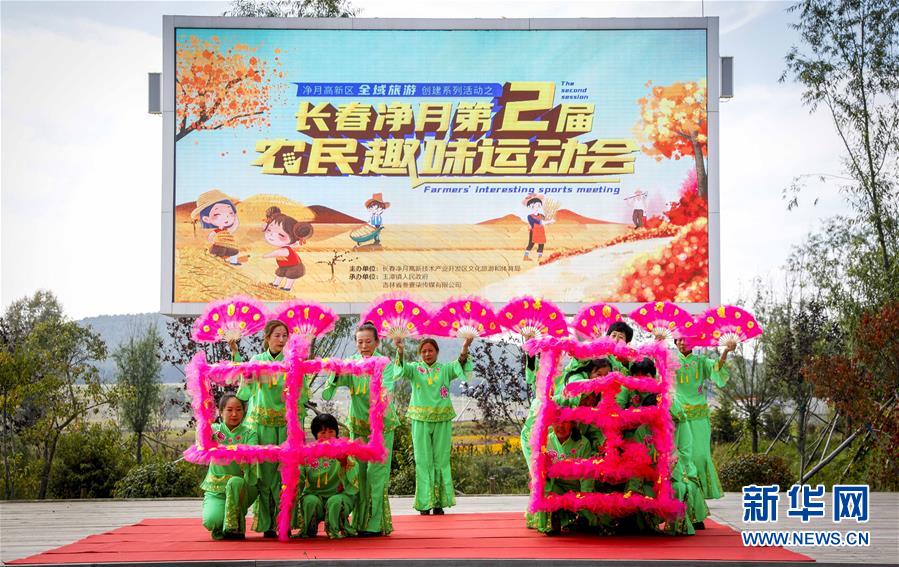 9月23日,表演者在农民趣味运动会比赛前进行文艺表演。 当日,一场别开生面的农民趣味运动会在吉林省长春市净月高新技术产业开发区玉潭镇友好村举行,来自周边多个村镇的近百名参赛选手在六个取材于农村日常生活的趣味运动项目中一决高下,在欢声笑语中喜迎收获季的到来。 新华社记者 许畅 摄
