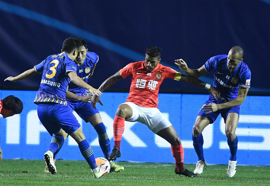 9月24日,广州恒大淘宝队球员保利尼奥(右二)在比赛中拼抢。 当日,在2020赛季中国足球协会超级联赛第一阶段(大连赛区)第13轮比赛中,江苏苏宁易购队以2比1战胜广州恒大淘宝队。 新华社记者 龙雷 摄