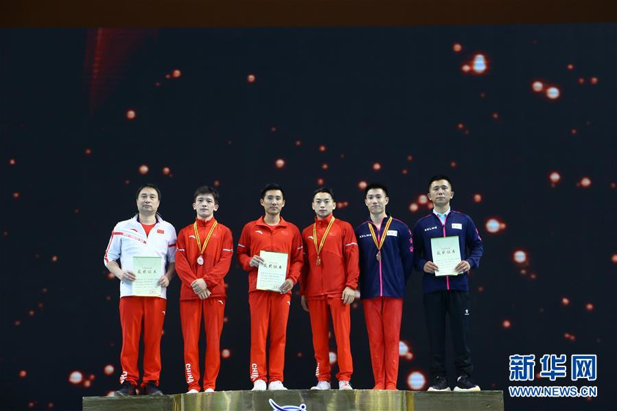 9月25日,获得男子体能比赛个人优胜奖第一名的国家集训队选手邹敬园(右三)与教练滕海滨(左三)、获得第二名的国家集训队选手谭迪(左二)与教练陈伟(左一)、获得第三名的山东队选手周才松(右二)与教练马勇在颁奖仪式上合影。 当日,2020年全国体操锦标赛男子体能比赛个人优胜奖颁奖仪式在广东肇庆举行。 新华社记者许雅楠摄