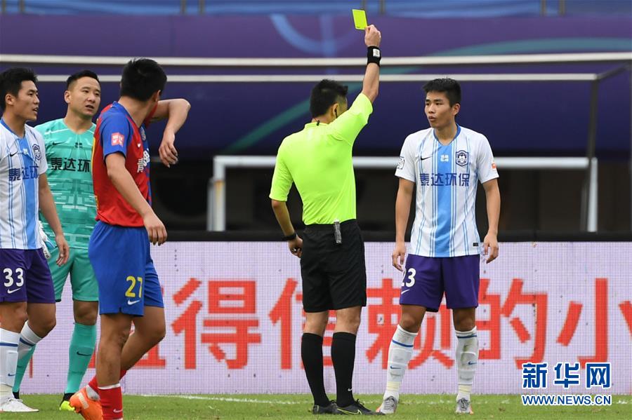 9月25日,主裁判金京元向天津泰达队球员钱宇淼(右)出示黄牌。 当日,在2020赛季中国足球协会超级联赛第一阶段(苏州赛区)第13轮比赛中,青岛黄海青港队以3比0战胜天津泰达队。 新华社记者韩瑜庆摄