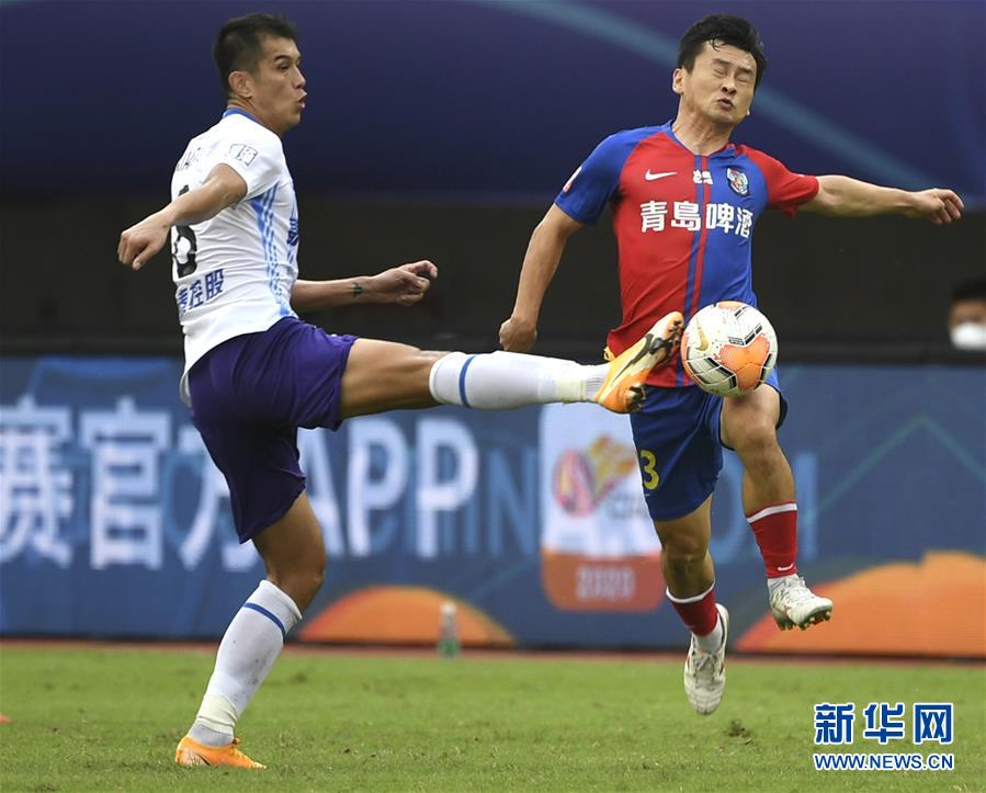 9月25日,青岛黄海青港队球员石哲(右)在比赛中防守天津泰达队球员肖智。 当日,在2020赛季中国足球协会超级联赛第一阶段(苏州赛区)第13轮比赛中,青岛黄海青港队以3比0战胜天津泰达队。 新华社记者韩瑜庆摄