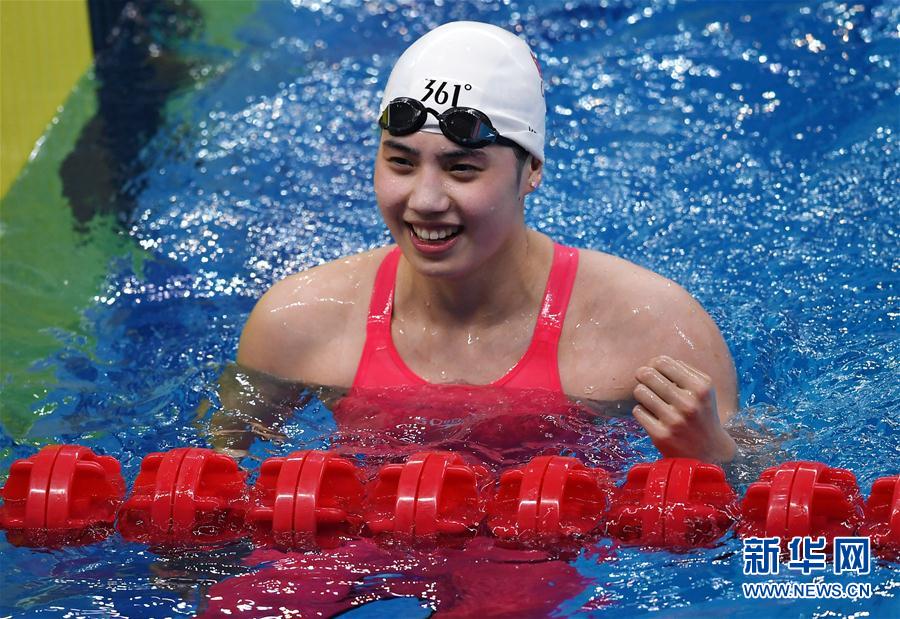 9月29日,张雨霏在比赛后庆祝。 当日,在青岛举行的2020全国游泳冠军赛暨东京奥运会达标赛女子100米蝶泳预赛中,江苏四方队选手张雨霏以55秒62的成绩获得第一名,并打破亚洲纪录。 新华社记者 李紫恒 摄