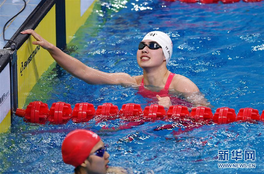 9月29日,张雨霏在比赛后庆祝。 当日,在青岛举行的2020全国游泳冠军赛暨东京奥运会达标赛女子100米蝶泳预赛中,江苏四方队选手张雨霏以55秒62的成绩获得第一名,并打破亚洲纪录。 新华社记者 李紫恒 摄
