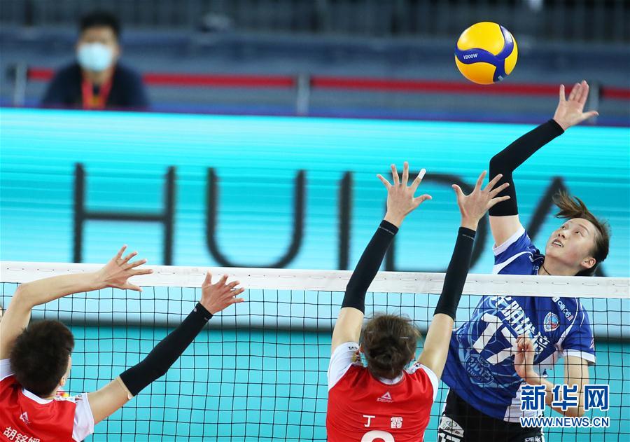 9月30日,上海光明优倍队球员仲慧(右)在比赛中扣球。 当日,在广东江门举行的2020年全国女排锦标赛第二阶段交叉赛中,上海光明优倍队以3比0战胜辽宁华君队。 新华社记者秦朗摄