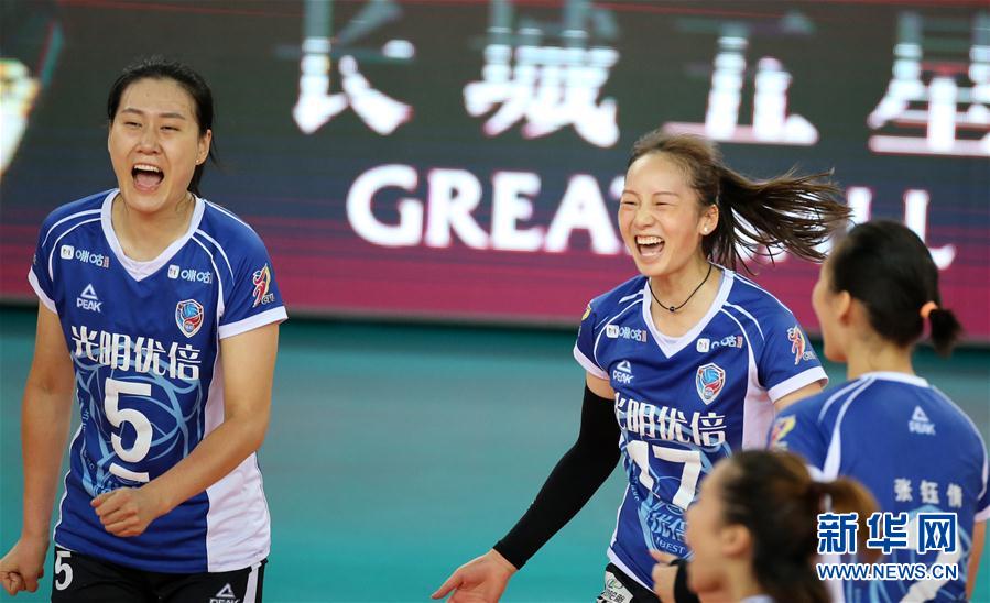 9月30日,上海光明优倍队球员张轶婵(左一)和队友仲慧(左二)在比赛中庆祝得分。 当日,在广东江门举行的2020年全国女排锦标赛第二阶段交叉赛中,上海光明优倍队以3比0战胜辽宁华君队。 新华社记者秦朗摄